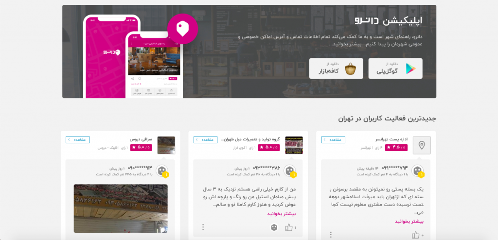 اگر دنبال جایی هستید و آن را پیدا نمیکیند، اگر به شهر دیگه ای رفتید و دنبال خدماتی هستید اما به آن شهر و مشاغل آن آشنایی ندارید، بهترین گزینه دانرو است. دانرو اپلیکیشن راهنمای اماکن ایران است و میتوانید با آن در بیش از ۵۰۰ هزار کسب و کاری که در دانرو حضور دارند، با استفاده از رای و نظرات مردم بهترین گزینه را انتخاب کنید و با استفاده از اطلاعات کسب و کار مانند موقعیت مکانی، اطلاعات تماس و آدرس با آن کسب و کار در تماس باشید.