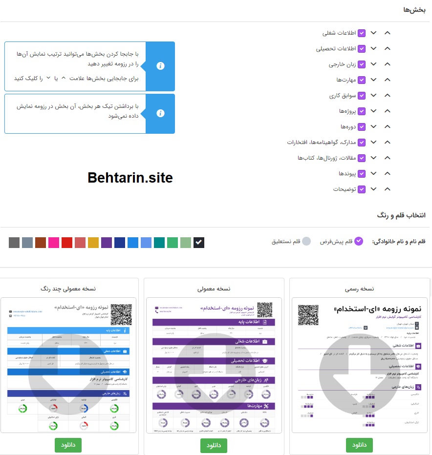آن ها امکانات زیادی در قسمت ساخت رزومه دارند. همانطور که می بینید، آپشن ها قابل باز و بسته شدن هستند. همینطور می توانید رنگ برای فایل رزومه خود در نظر بگیرید یا حتی از چند تم این سایت استفاده کنید. هر تم، کارکرد خود را دارد. برای مثال رزومه رسمی یا چند رنگ که بنا بر شخصیت و توانایی های هر فرد متنوع است.