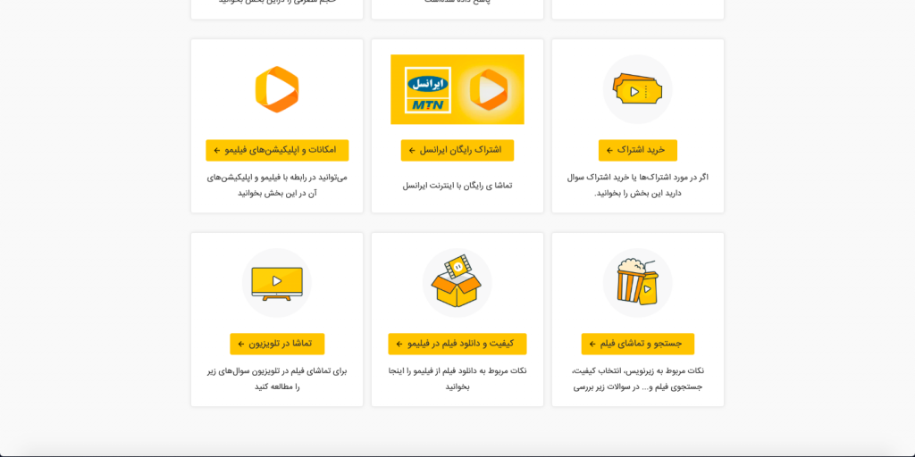 در کنار سایت اصلی فیلیمو، بخش سوالات متداول وجود دارد که در آدرس https://help.filimo.com/fa قابل دسترس می باشد. در این بخش سوالاتی که بیشتر کاربران به آنها برخورد میکنند در دسته بندی های مشخص وجود دارد. در نهایت در صورتی که از پرسش و پاسخ موجود در این سایت پرسش هایتان برطرف نشد میتوانید در انتهای این سایت با بخش پشتیبانی آنلاین در تماس باشید.