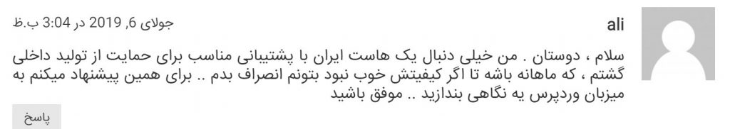 «دوستان، من خیلی دنبال یک هاست ایران با پشتیبانی مناسب برای حمایت از تولید داخلی گشتم که ماهانه باشه تا اگر کیفیتش خوب نبود بتونم انصراف بدم. برای همین پیشنهاد می کنم به میزبان وردپرس یه نگاهی بندازید»