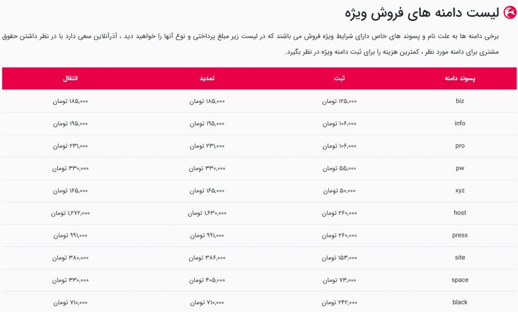 اگر دامنهای مربوط به یک موقعیت جغرافیایی نشود و یا بین دامنههای شاخصی مانند com و net قرار نگیرد، دامنه ویژه شناخته می شود. آذرآنلاین سعی می کند با در نظر داشتن حقوق مشتری برای دامنه مورد نظر، کمترین هزینه را برای ثبت این دامنه های خاص در نظر بگیرد. از جمله این دامنه ها می توان به biz، info، pro، pw و host اشاره کرد و هزینه ثبت آن ها بین 50 تا 250 هزار تومان متفاوت است. از اینجا می توانید به این قسمت از سایت دسترسی پیدا کنید.