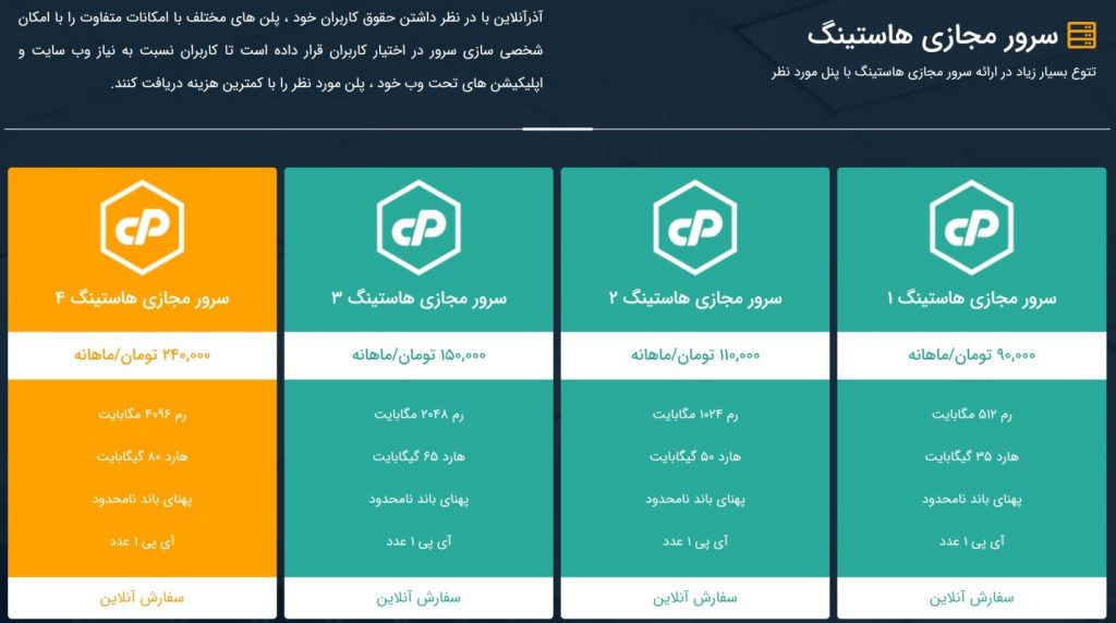 سرویس مجازی هاستینگ جدا از نصب سیستم عامل دارای یک پنل وب هاستینگ به انتخاب مشتری با لایسنس معتبر است که موقع ارائه سرور مجازی، پنل به صورت کامل بر روی آن نصب و همراه با تنظیمات اولیه، ارائه می شود. اگر این سرویس را دریافت کنید، پنل ساده و محبوب Directadmin با لایسنس معتبر، پنل قدرتمند CPanel، پنل وب هاستینگ قدرتمند Plesk و کنترل پنل ارزان قیمت و البته پر قدرت Interworx هم برایتان نصب می شود که البته برای سرورهای ویندوزی، تنها Plesk ارائه می شود. این سرویس ها از ماهانه 90 هزار تا 240 هزار تومان هزینه دارند.