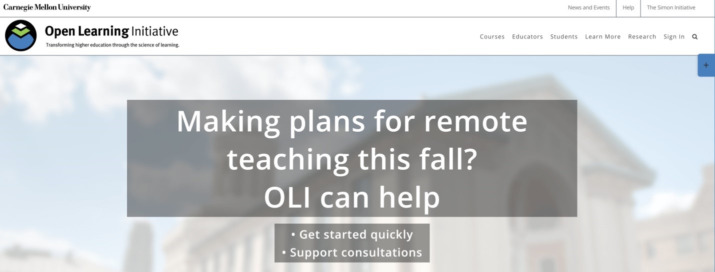 بخش Open Learning Initiative وبسایت کارنگی ملون که از این پس از نام مخفف آن (OLI) استفاده خواهیم کرد، زیر نظر دانشگاه کارنگی ملون در پنسیلوانیای آمریکا است. ارتقای یادگیری از طریق علم و دموکراتیک کردن یادگیری مهم ترین اهداف بنیانگذاران OLI عنوان شده است. آن ها تلاش می کنند کلاس های حضوریشان را کم هزینه و حتی رایگان ارائه کنند.