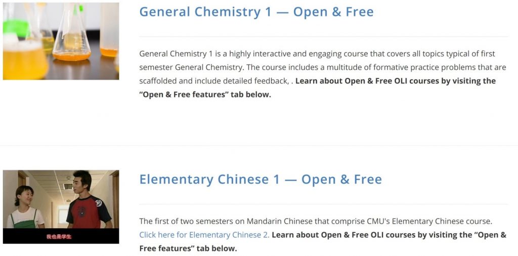 وبسایت OLI دو بخش جدا از هم دارد. بخش اول مربوط به دانشجویان دانشگاه کارنگی است که می توانند با نام کاربری و شماره درس خود در سایت لاگین کرده و از مطالب سایت استفاده کنند. سایر افراد اما باید سراغ قسمت مستقل سایت (اینجا) بروند که نیازی به ثبت نام یا بارگذاری مدارک ندارد و بسیاری از مطالب آن هم رایگان است. می توانید تنوع گسترده ای از موضوعات را برای یادگیری روی سایت مشاهده و انتخاب کنید.